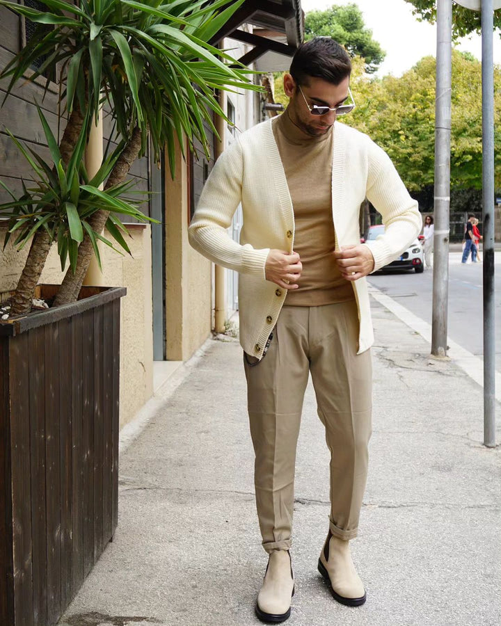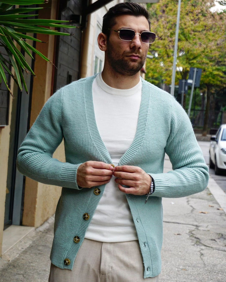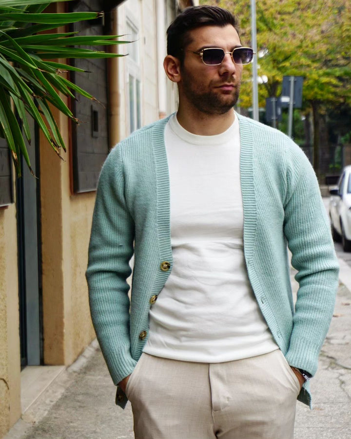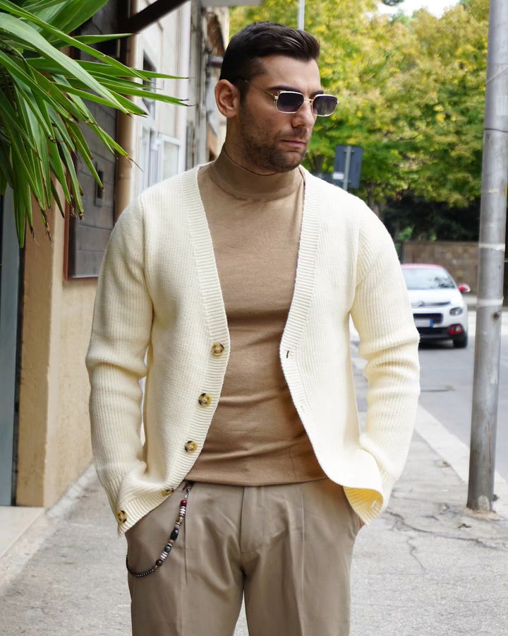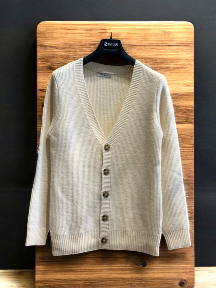 Questo cardigan, con bottoni in osso, è realizzato in morbido cotone e poliestere, garantendo una vestibilità regolare. Ideale per un look elegante e confortevole, è il mix perfetto di stile e comodità. IL MODELLO INDOSSA UNA M ALTO 1.77 PESO 77KG