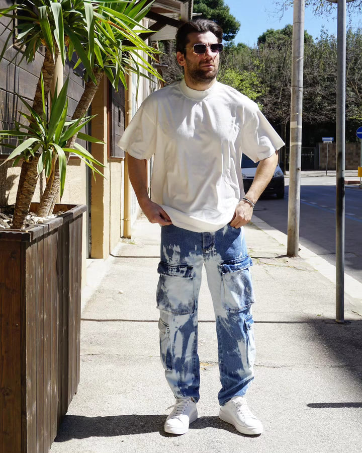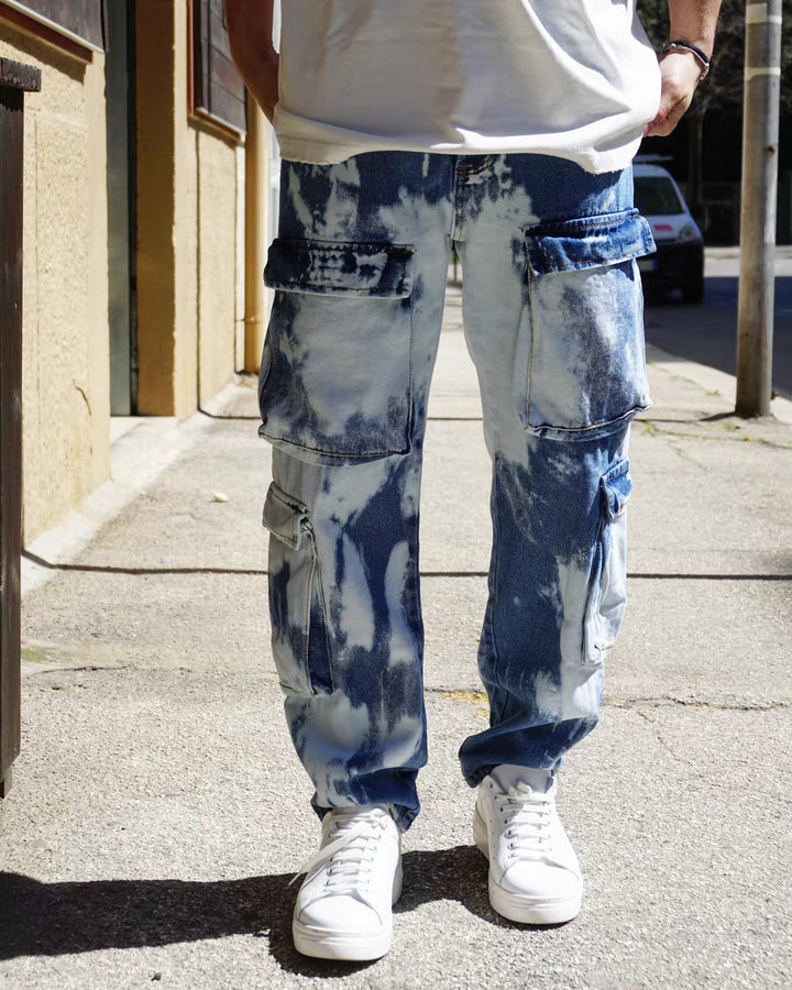 Cargo slavato in tessuto jeans con tasche e regolazione della vita. Comodo, pratico e alla moda, questo cargo è perfetto per tenere tutto ciò che ti serve a portata di mano. La regolazione della vita ti permette di adattarlo perfettamente al tuo corpo, donandoti un look moderno e casual.