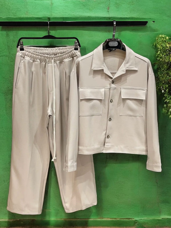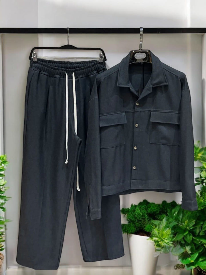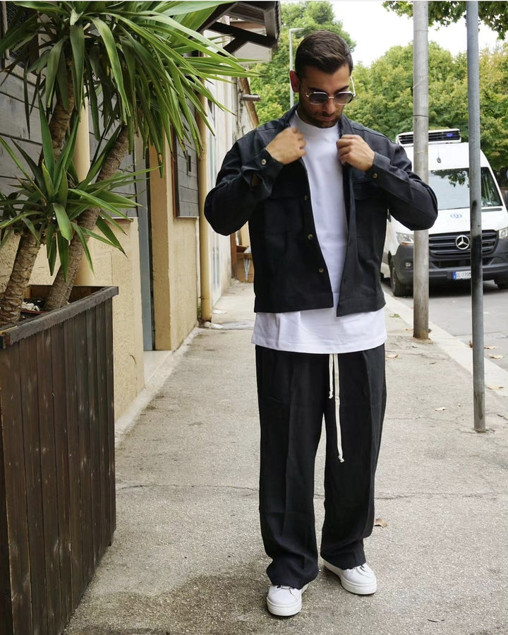 Il completo palazzo è composto da un pantalone a palazzo e una giacca dal taglio moderno e confortevole. Il modello, in tessuto autunnale, indossa una taglia M, con una altezza di 1.77 m e un peso di 77 kg. Ideale per uno stile casual e d'avanguardia. giacca piu corta