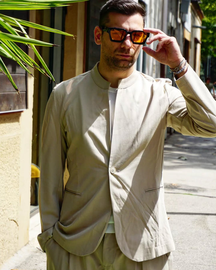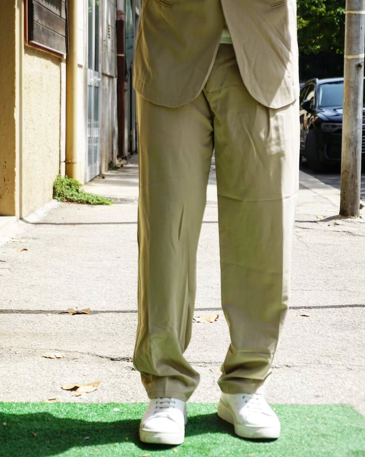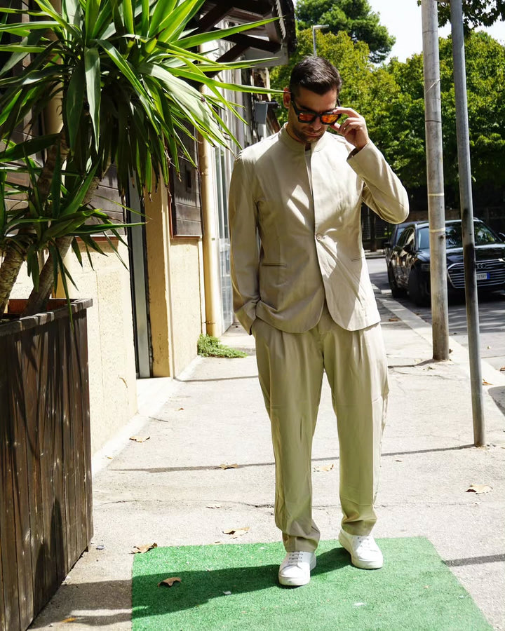 Il completo coreano  è l'abbigliamento perfetto per la stagione estiva. Il suo modello veste  regolare e la vestibilità adatta garantiscono un look comodo e sofisticato. Il tessuto è estremamente morbido, ideale per le calde giornate. Il modello indossa una taglia M, con un'altezza di 1.77m e un peso 77kg