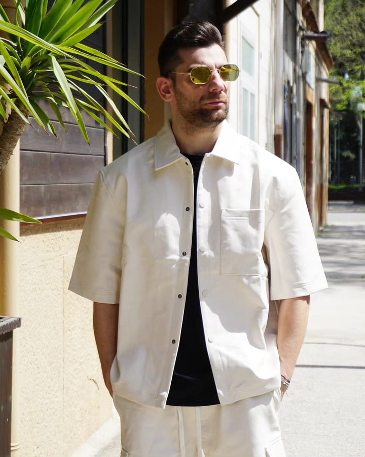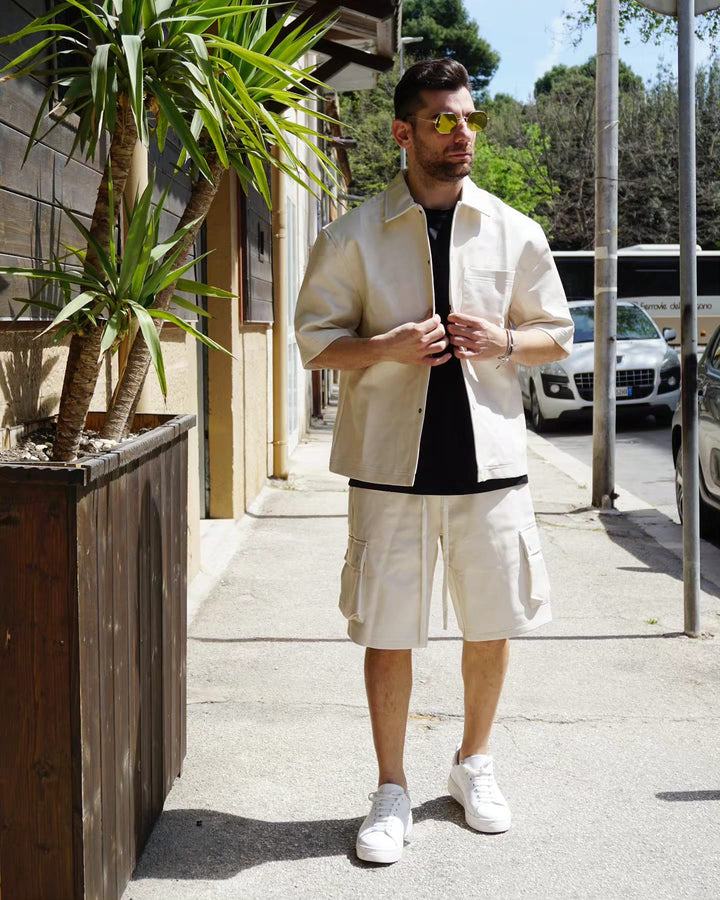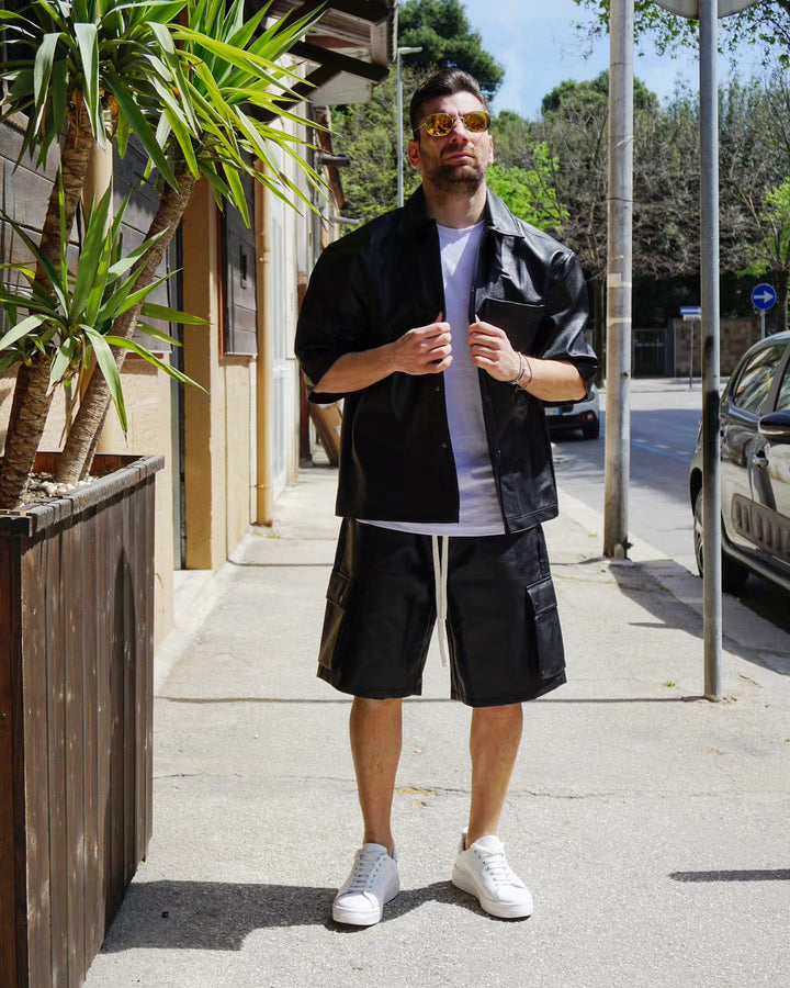 Questo completo pelle è composto da una giacca e un pantaloncino cargo over, entrambi realizzati in eco pelle. Il design sostenibile e moderno è perfetto per chi cerca uno stile unico e rispettoso dell'ambiente. Lasciati sorprendere dalla qualità e dal comfort di questo completo!