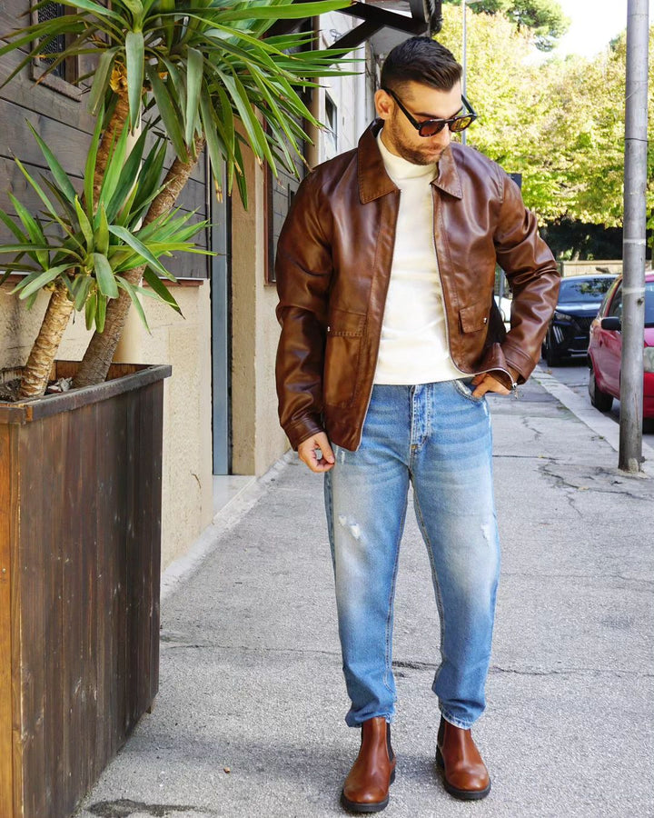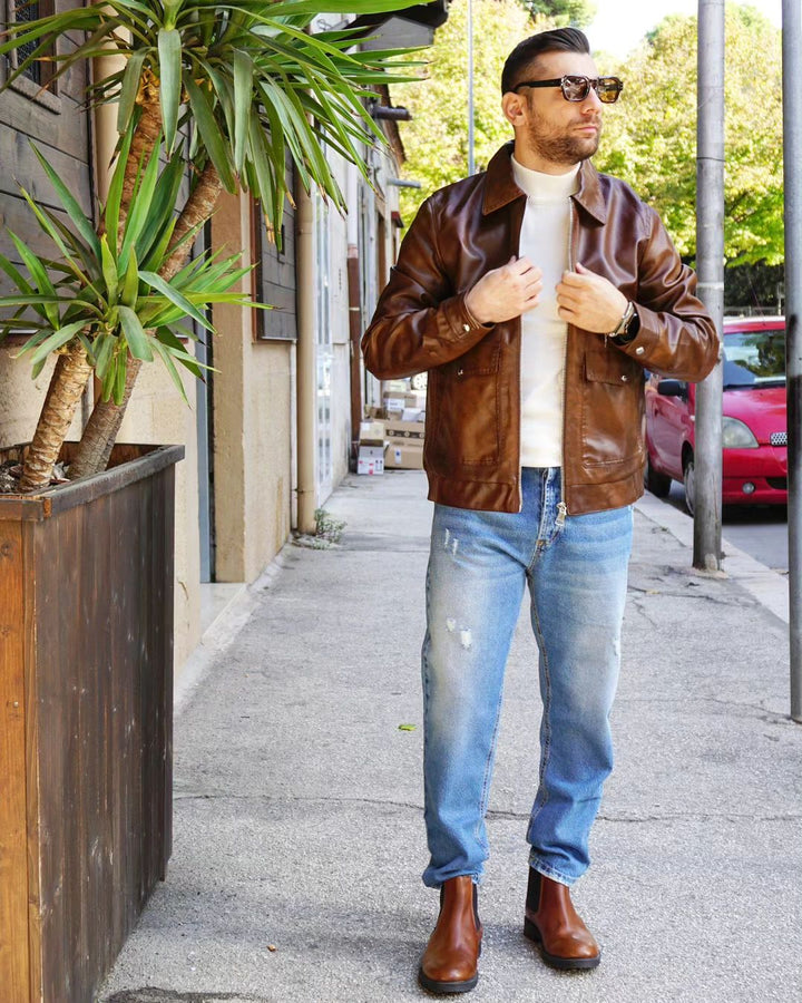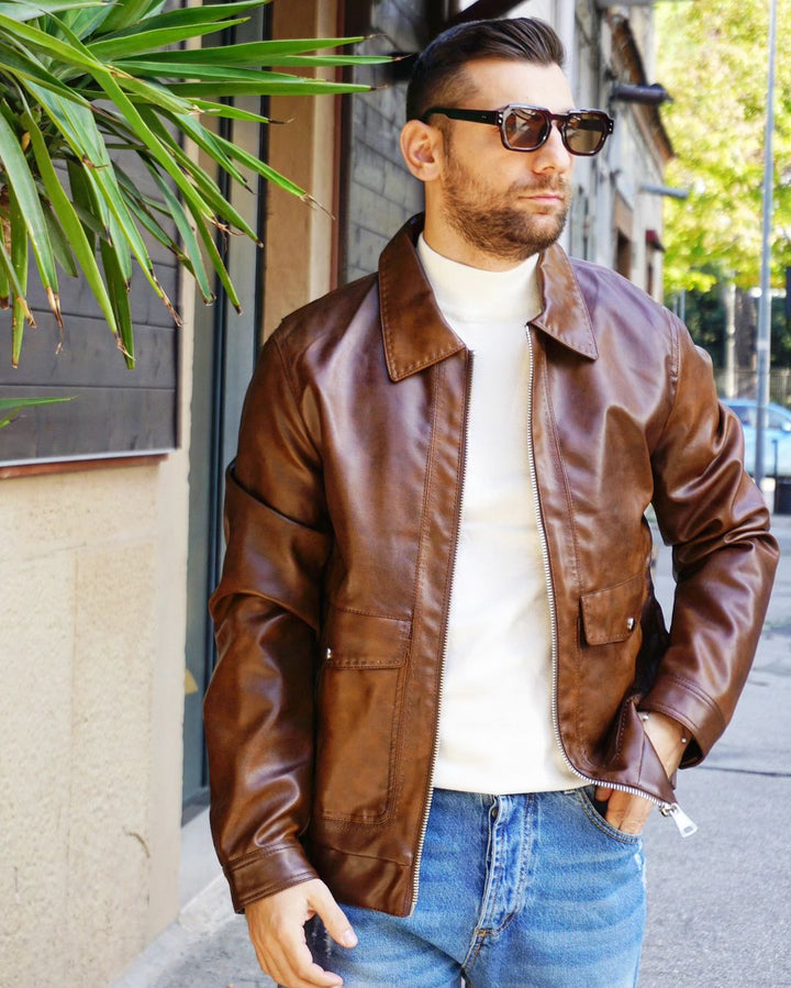 Il giubbino vintage è realizzato in eco pelle invecchiata e veste in modo regolare. Grazie al suo design retrò, dona un tocco di classe al tuo look. Il modello indossa una taglia M, alto 1.76 e pesa 77kg, garantendo una vestibilità confortevole e adattabile a diverse silhouette.