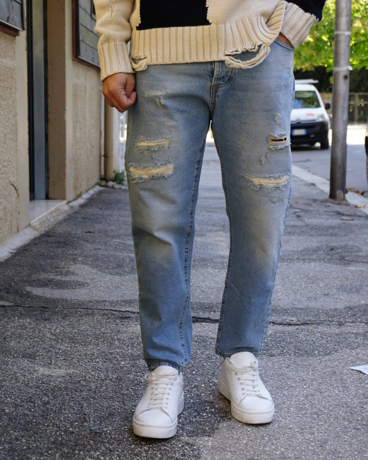 I nostri jeans si distinguono per la loro vestibilità perfetta e il loro stile graffiato che li rende perfetti per ogni mood. Realizzati con cura nei dettagli, sono ideali per l'estate grazie alla loro lunghezza capri. Garantiti al 100% per un look casual ma sempre alla moda. il modello indossa la 46 alto 1.77 peso 77kg