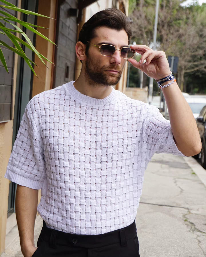 Questa maglia lavorata è perfetta per tutte le occasioni, grazie alla sua vestibilità semi over e comoda. Realizzata con una lavorazione di alta qualità, garantisce un look elegante e versatile. Ideale per un uso quotidiano o per un'occasione speciale, questa maglia è un must-have nel tuo guardaroba.