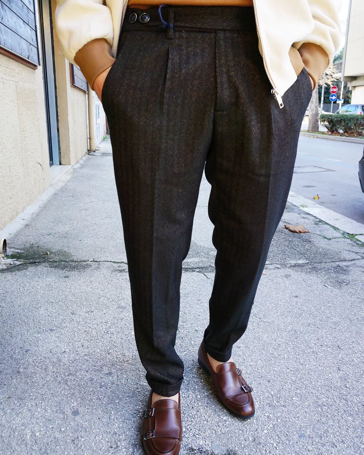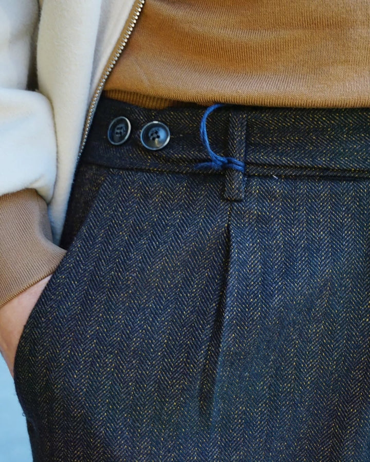 Questo pantalone sartoriale spigato è l'eleganza italiana al suo meglio. Con una vestibilità regolare e una fantasiosa tessitura in microfibra, questo pantalone è fatto a mano in Italia e presenta una sofisticata abbotonatura laterale per un tocco di raffinatezza. Indossa l'artigianalità e lo stile italiano con pant sart.
