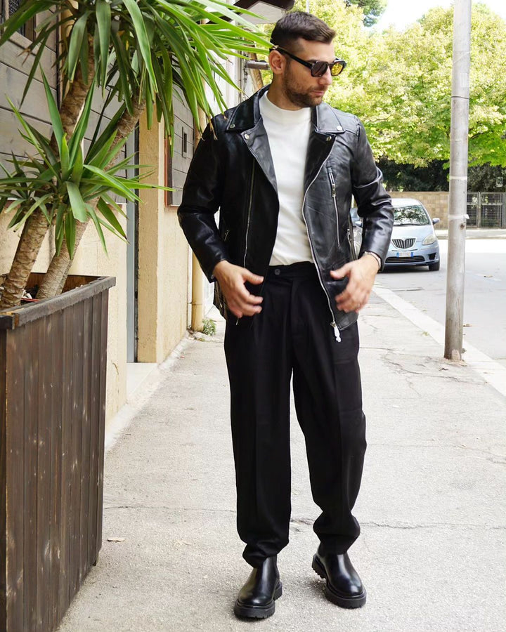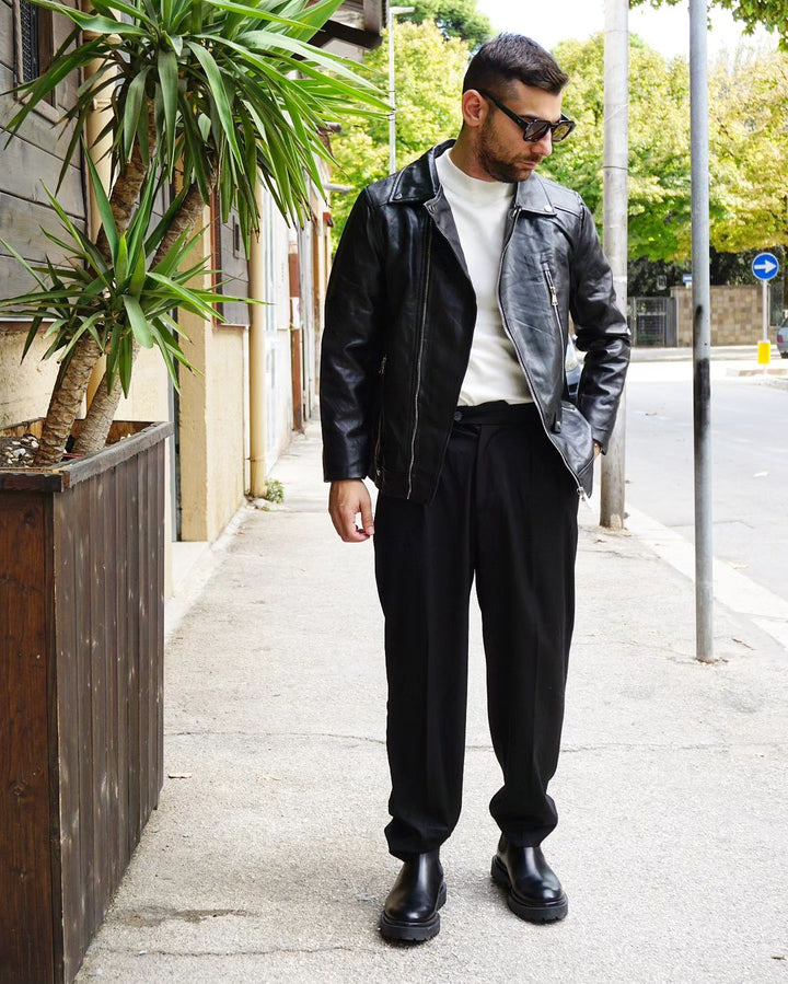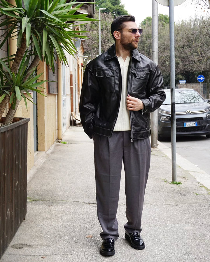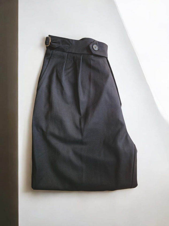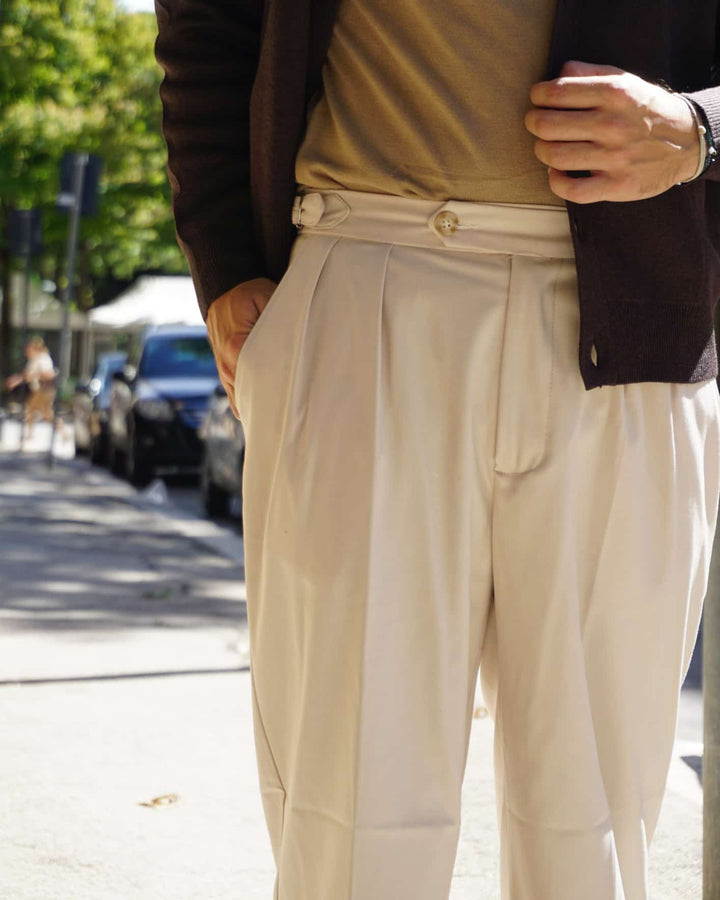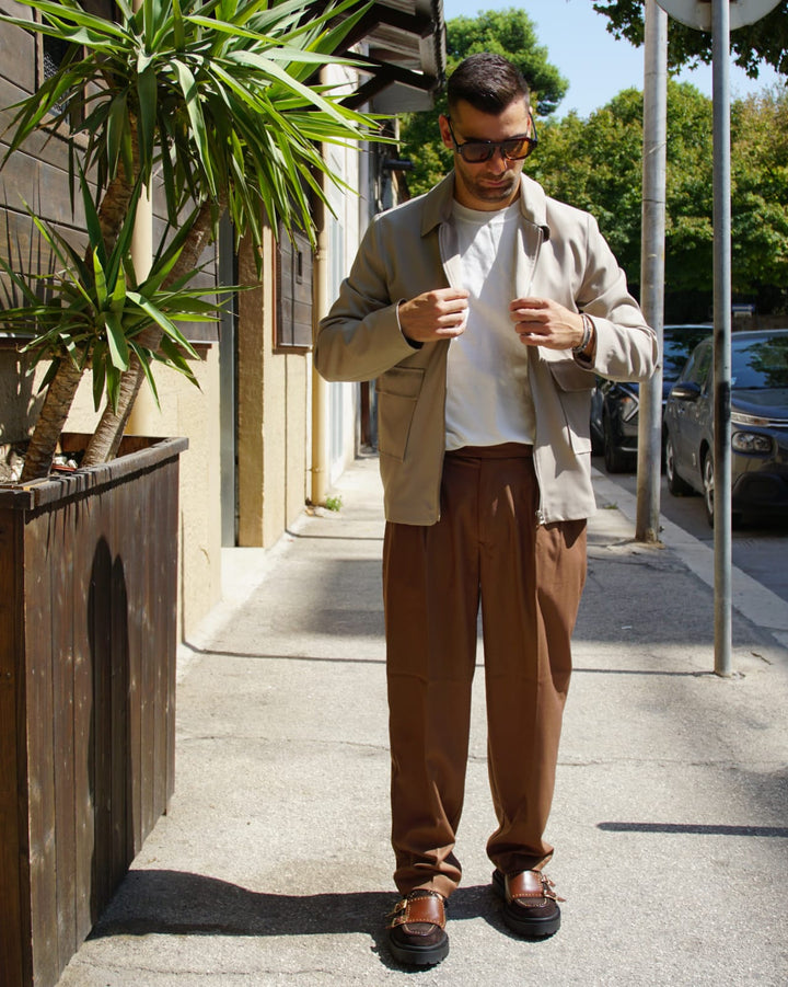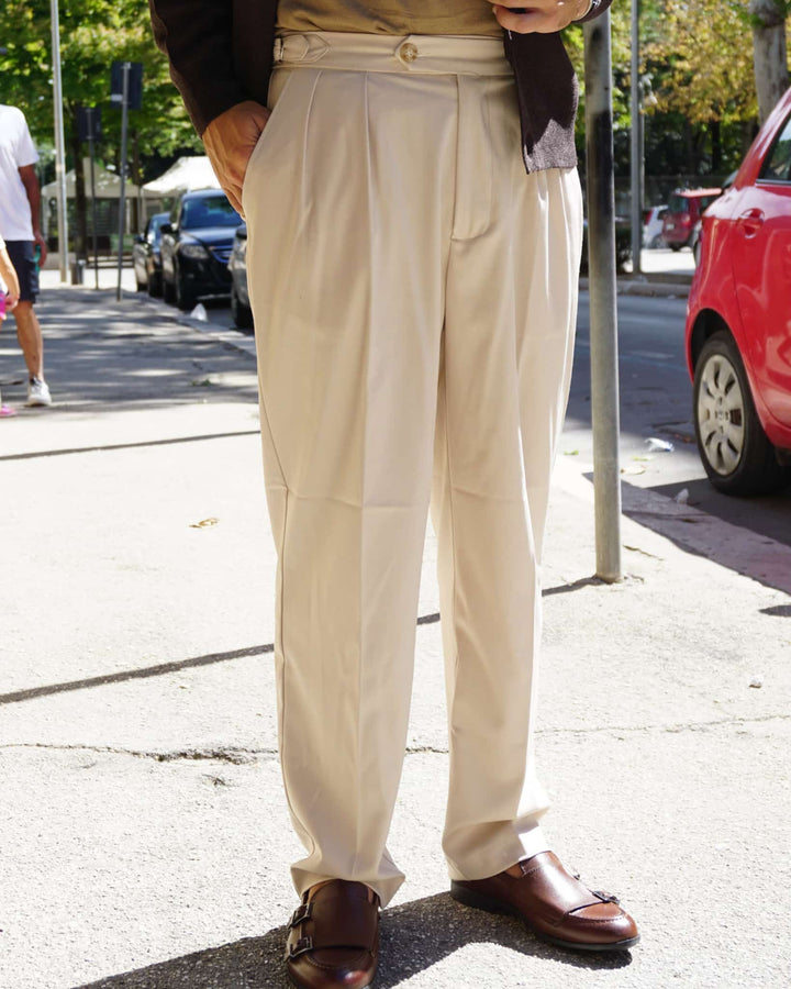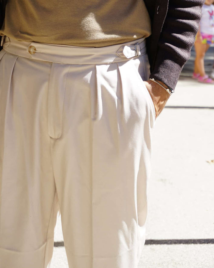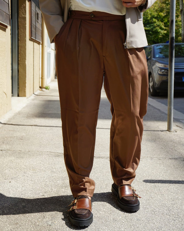 Questo pantalone sartoriale è perfetto per l'autunno grazie al suo fondo semi largo che permette di indossare scarpe di diverso tipo. e le fibbie laterali aggiungono un tocco di stile e praticità. Veste comodamente grazie alla sua vestibilità regolare. io modello indossa una 46 alto 1.77 peso 77 kg